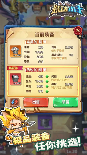 3、如果出现重复的装备,就需要玩家选择是装备上还是出售掉,此时大家要对比两件装备的速度、生命、攻击和防御等数值,选择属性值高的装备,就把剩下的出售掉;然后继续开宝箱;