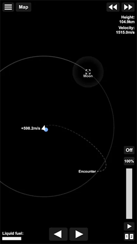 点击喷射器可以打开发动机,点击off和on可以打开关闭燃料,滑动可以加大推力但是燃料消耗更快,跟着箭头的指示奔月吧。