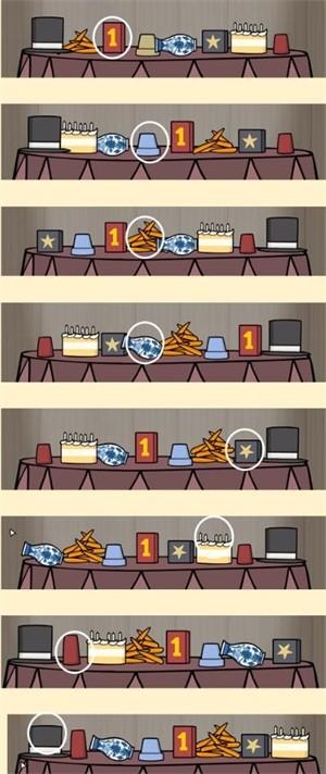 4、第四幕:调整手枪的发射方向,将5只帽子与棒球击落。之后将棒球,以及紧接着掉落的其他物品放到对应的帽子里。