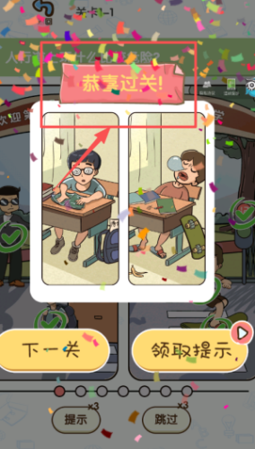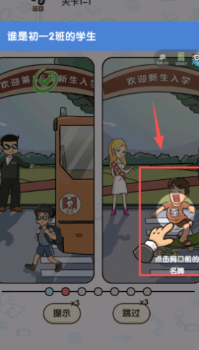 2、找初一2班学生,点右边小男孩胸口名牌查看信息,或观察场景对比,也能点提示或跳过。