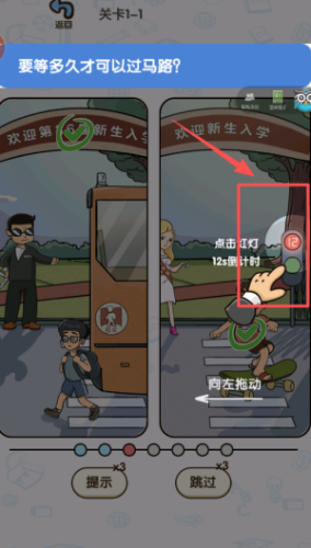 3、看红灯12秒倒计时,按箭头提示向左拖动信号灯,等绿灯过马路,或者点提示或跳过。