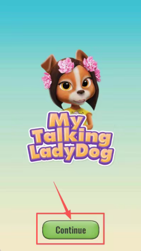 1、点紫色渐变背景的绿色Continue箭头按钮,开始进入My Talking LadyDog游戏。