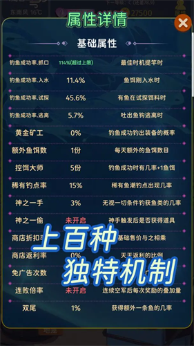 从零开始的钓鱼人生免广告版是一款将肉鸽玩法与钓鱼体验巧妙结合的创新手游,游戏打破了传统钓鱼游戏的操作门槛,让完全没接触过台钓的玩家也能轻松享受垂钓乐趣。游戏最大的亮点在于将肉鸽游戏的核心乐趣完美融入钓鱼场景,玩家的每次抛竿都像开启一个随机宝箱,玩家可以通过组合上百种天赋、道具和装备,打造专属的钓鱼流派。无论是追求极限手速的速钓流,还是专注稀有鱼种的特化流,总有一套build适合你的游戏风格。除了硬核的钓鱼系统,从零开始的钓鱼人生免广告版这款游戏还准备了超丰富的剧情内容,随着主线推进,不同周目会解锁截然不同的剧情走向,更有多条隐藏故事线埋藏在日常事件中。这些剧情与钓鱼玩法环环相扣,比如特定鱼种会触发特殊事件,让游戏过程充满探索的惊喜。感兴趣的玩家快来下载体验吧。