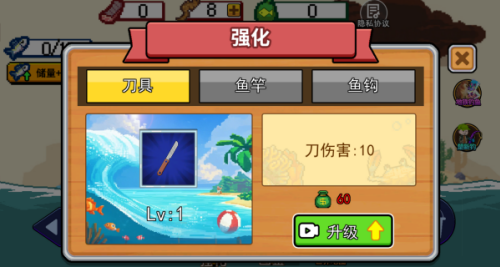 4、我们在获益之后,可以使用金币,去升级我们的刀具以及鱼竿的。