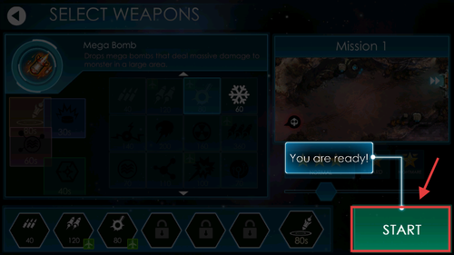 2、在武器选择界面挑选合适的武器组合,确认后点击START开始Mission1的防御任务。