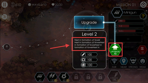 4、点击绿色UPGRADE按钮并支付40资源,可将已建塔升级至Level2,显著提升防御能力。