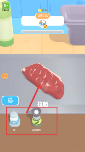2、进入料理台界面,将下方的盐和胡椒粉撒在牛肉上,完成基础调味步骤。