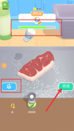 3、调味过程中注意进度条,点击左侧按钮给牛肉翻面,调好后点“完成”进入下一环节。