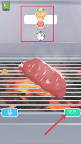 4、根据“五分熟”提示和计时器控制烧烤时间,烤好后点击“完成”将牛排交给顾客。