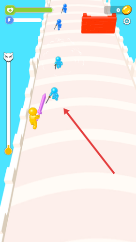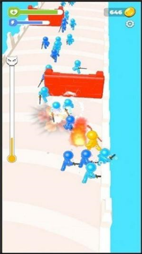 2、移动角色靠近蓝色敌人自动发起攻击,同时注意躲避对方反击并收集散落的金币。
