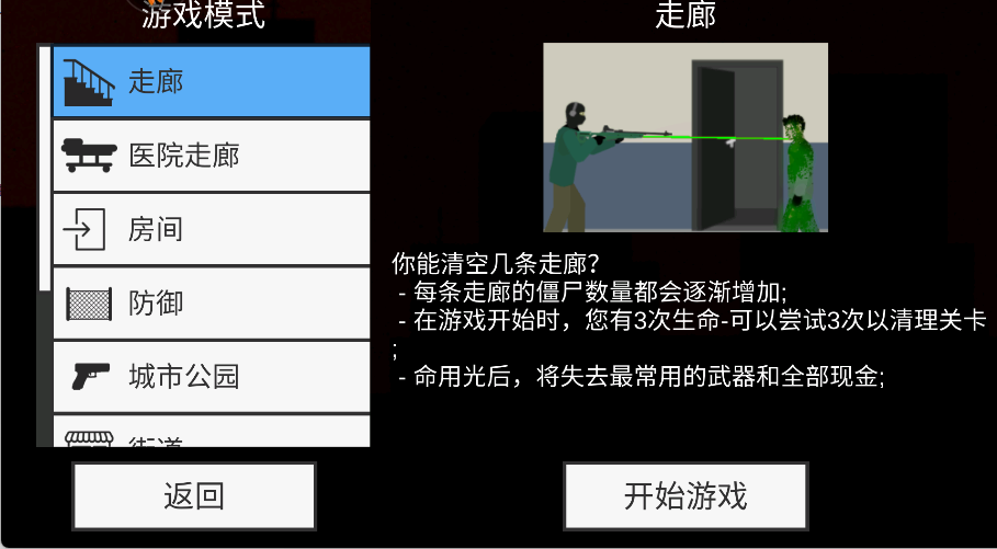 4、经典的横版闯关模式,玩家需要拿起武器和不同的僵尸进行作战。