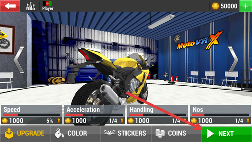 2、进入摩托改装页面后,点右下角NEXT按钮跳转至关卡选择界面。