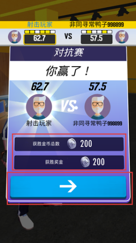 4、获胜后点击蓝色箭头可继续挑战新对手,不断积累经验提升射击水平。