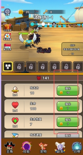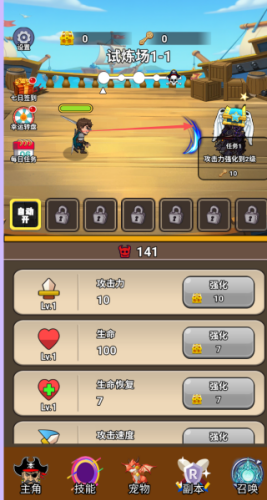 1、进入到游戏中,我们可以看得主要的玩法就是控制角色在试炼场中不断去战斗和升级。