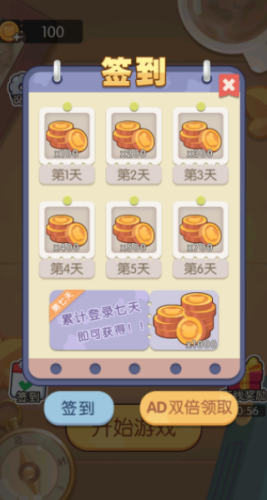 1、进入游戏后,你可以看到每天签到获得的奖励,第一天可以获得100金币。