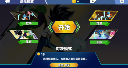 2、游戏提供了很多模式,有故事、对决、生存和训练,难度选择简单。