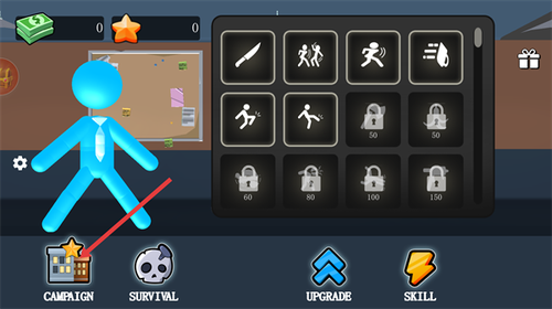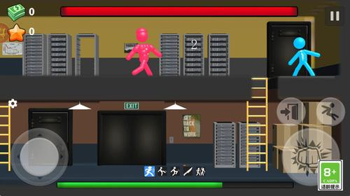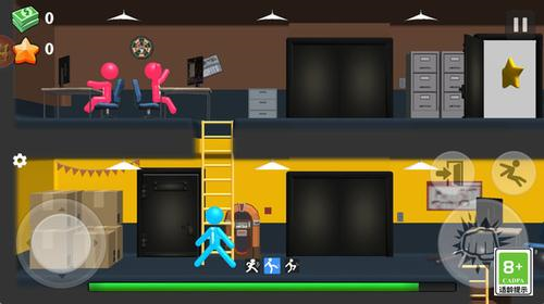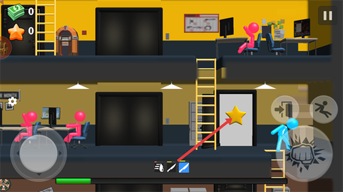 5、用虚拟摇杆控制火柴人移动,爬梯子、穿房间,接近敌人,点击攻击键暗杀,悄咪咪解决对手。