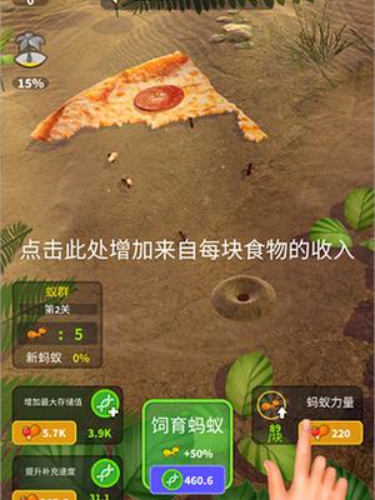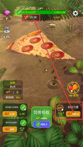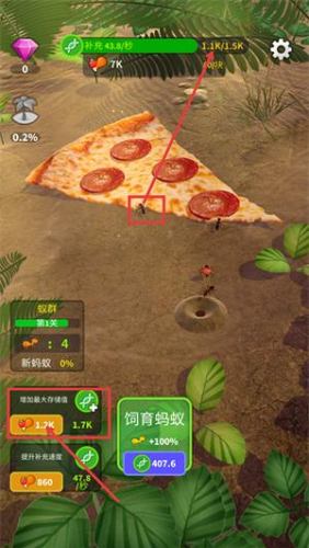 1、处于蚁群第1关时,点击饲育蚂蚁按钮,消耗3192资源,使蚂蚁数量提升100,助力高效获取披萨类食物资源。