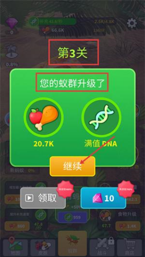 4、完成第3关后蚁群完成升级,可领取207K食物与满值DNA,点击继续按钮即可开启后续游戏内容。