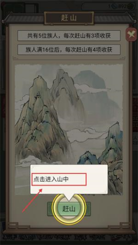 3、点击主界面赶山按钮,派遣当前五位族人进山采集,可一次性获得三项基础资源用于初期建设。