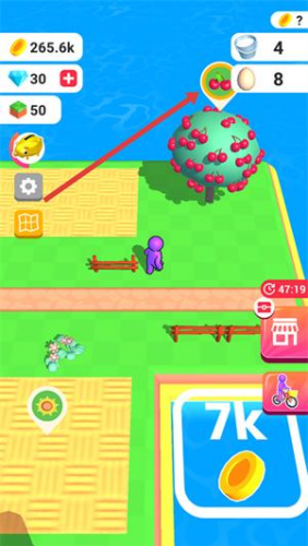 1、操控角色在农场地图中自由移动,找到结满果实的樱桃树并靠近触发互动提示。