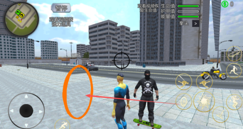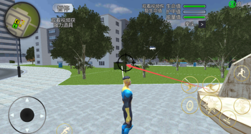 5、通过虚拟摇杆控制无敌少侠移动,点击绳索技能按钮发射绳索,钩住高楼实现空中穿梭,快速抵达城市各个角落。