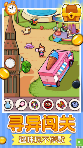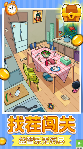 7、融入轻度解谜元素,部分关卡需串联线索才能找到隐藏物品,观察力与逻辑思维双重锻炼。