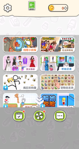 1、进入游戏后,你可以看到很多玩法,有找茬小侦探、花光所有钱和美女换装等。