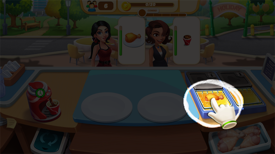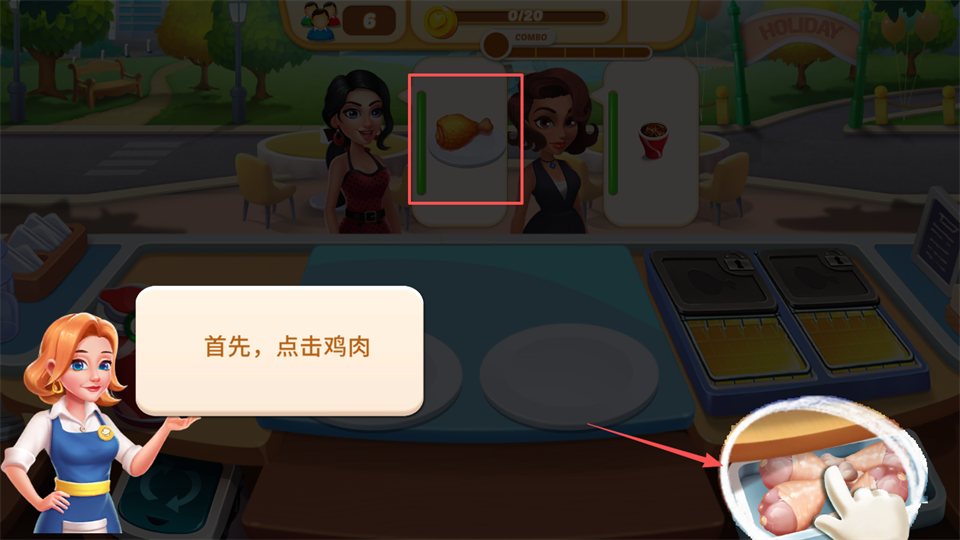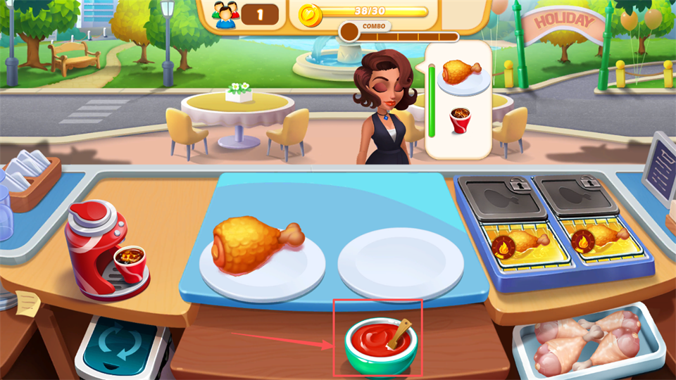3、随后点击台面上的炸鸡腿交付给顾客,即可获得金币收益。