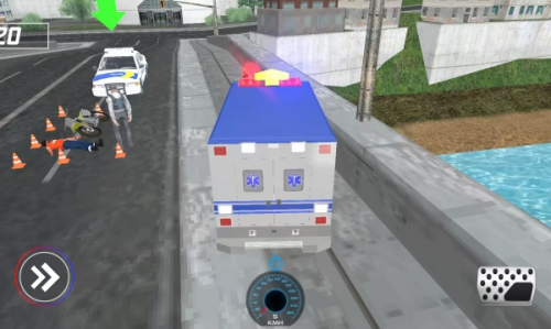 1、在虚拟的3D城市里,会有各种意外发生,玩家驾驶救护车进行救人任务。