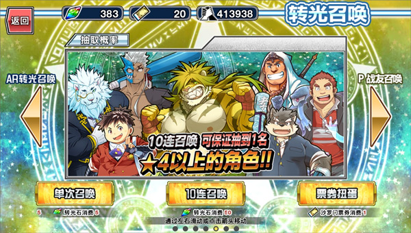 除了极少数角色能够通过活动获取外,游戏中的大部分角色均需要通过“转光召唤”进行扭蛋抽取来获得,扭蛋抽取分为转光召唤、期间限定召唤、AR转光召唤、战友召唤,进行召唤需要消耗转光石或沙罗门票券。