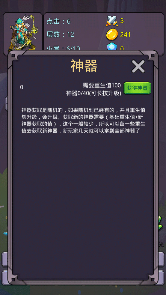 脑力风暴:这不仅仅是放置!在海量【神器】的搭配选择中,充分发挥你的策略思维。精心规划每一次【重生】(例如,初期如何分配5次重生机会),与其他勇者一较高下,看谁能更快登顶战力巅峰!