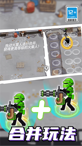 2、拖动火柴人进行合并操作,获取更高级的火柴人,增强防线实力。