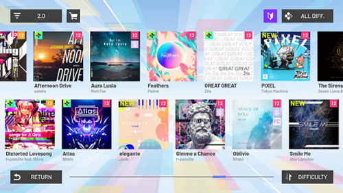 7、曲库包含从简单到专业的四个难度级别谱面设计,每首歌曲都配有不同颜色的难度标识,从绿色入门到深黑色地狱级别。