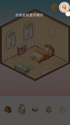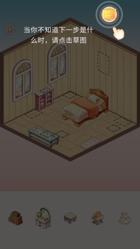 2、当玩家没有思路的时候,可以点击草图查看房间完成图,找到家具摆放位置的参考。