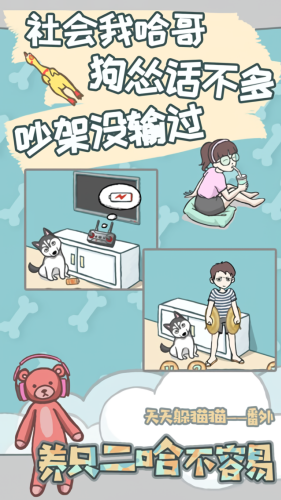 养只二哈不容易破解版手机版是一款休闲益智闯关类的手机游戏,游戏中玩家扮演一只二哈的主人照顾可爱的狗狗,玩家在游戏中会遇到各种搞笑的场景,玩家需要利用自己的聪明才智帮助狗狗逃离麻烦,游戏以诙谐幽默的画风,和二哈的日常,以及丰富的谜题,将非常好玩的游戏带给大家体验。游戏将二哈与你之间发生的各种趣事呈现出来,并把那些难忘的片段融入关卡中,在解谜闯关的过程中,游戏也展现了主人与二哈之间那些有趣温馨的日常,将搞笑、诙谐的回忆浓缩其中,让玩家更深刻地感受与二哈相处的欢乐,游戏非常的有趣好玩,喜欢的朋友欢迎下载体验。