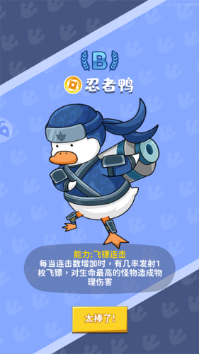 6、逐步成长:通过升级和强化,鸭子从普通小鸭逐渐成长为强大的战斗鸭,带来更高的战斗力。