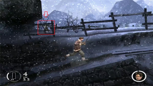 消灭敌人后前行在吊桥那爬上去,发现回到了之前山寨,在这摇把手把吊桥接好后过桥,过桥会发现同伴在这,后面有很多敌人追来,这里又可用重机枪扫敌,注意不要让任何一敌人走过桥,否则没命,过后会有敌人拿火箭炮来追击,尽快调查左右2边的那尊金佛像把佛像推进去打开一扇门,里面扳动把手开启另一扇门后通过来到一村落。