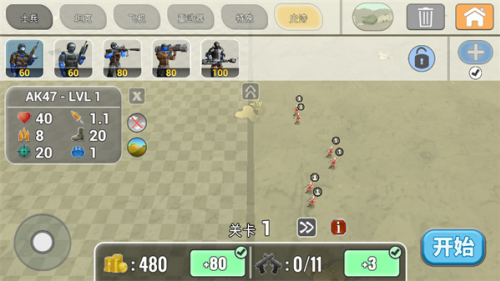 2、在关卡中选择适合的兵种进行布阵,布阵完成后点击“开始”。