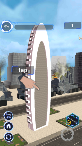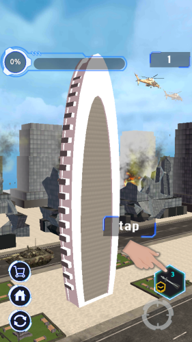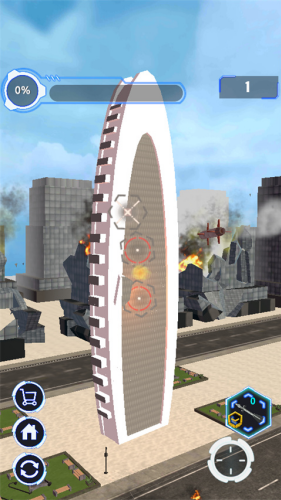 1、下载城市拆迁并打开进入游戏,我们会面对一座需要拆迁的建筑,通过点击武器按钮选中武器。