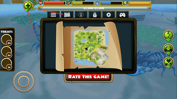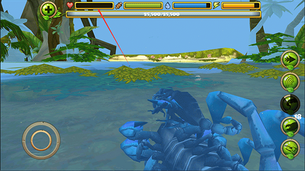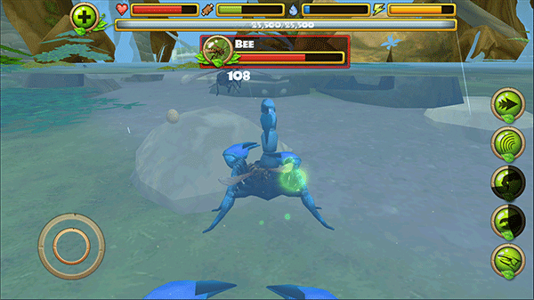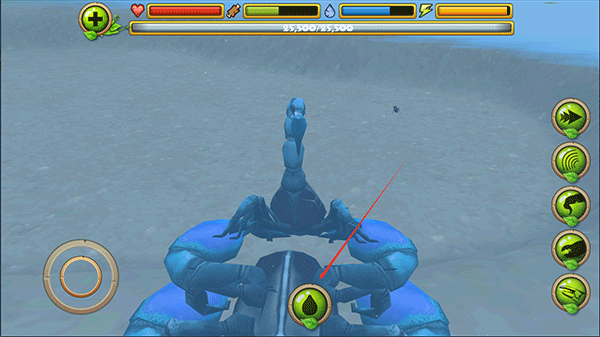 3、在探索的途中你可以攻击别的动物,如蜻蜓、鸟、蛇、青蛙等待,右侧按按钮由上至下分别是加速、眩晕、尾刺攻击、钳子攻击,吃。