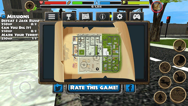 在屏幕的上方有五条状态栏相信大家在玩的过程中也有注意到,那么现在小编就为大家介绍一下作用,最下面的那条最长的是经验值,当经验值满了之后狗狗就会升级,升级之后各项属性都会增加,并且上方四条状态栏全满。上方第一个是健康值,这是保证玩家操控的狗狗由于别的狗狗一战的资本,如果这条状态栏空了,那么游戏就结束了。第二个是饥饿值,玩家们可以通过吃东西来让这一条状态栏满,第三个是渴度,玩家们可以通过喝水来让这一条状态栏满,在这里有一点要说明一下,如果这两条其中一条空了,那么狗狗的健康值就会持续下降,如果健康值也没了,游戏就结束了,最后一条是耐力值,这一条影响着狗狗跑步能够跑多远,跑得越远消耗的越大,如果没耐力了也不要紧,只需要原地休息一会。耐力值就会恢复上来了。在这里小编教大家一个小技巧,因为这个游戏是即时保存的,所以玩家们的上方状态栏不太好的时候,可以退出游戏。然后再进入,那么状态栏就会变成正常状态了,这一条在找不到补给的时候特别好用,当然,如果四条状态栏都特别好的时候不推荐使用。