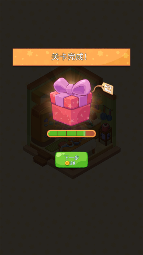 1、闯关获金币推进进程,点击关卡箱子开物品,依提示放对应位置完成布置。