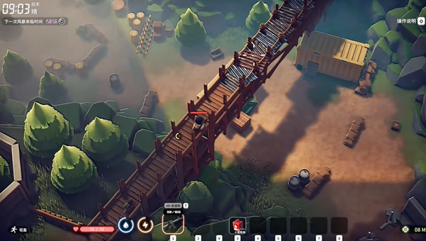 修下图所示位置的桥,玩家可以从上面的传送点往下走到桥,也可以走下面的传送点往上走到桥。