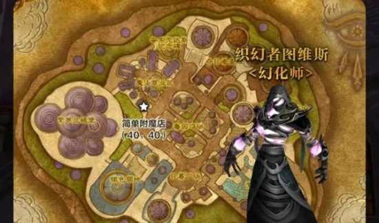 幻化师织幻者图维斯位于达拉然魔法商业区的简单附魔店,坐标(40,40)。