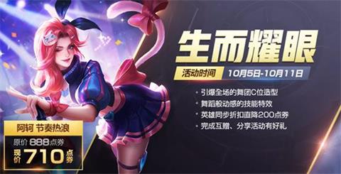 王者荣耀特效充值活动开启 阿轲新皮肤上架王者荣耀正式服在10月5日开启一轮新活动,包括累计登录送头像框、阿轲新皮肤上架、特效礼包充值活动。其中阿轲新皮肤首周折扣710点券,在10月5日0点正式上架,节奏热浪属于非限定史诗皮2019-10-19 -